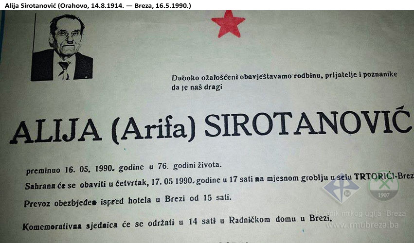 Svako ima svog Aliju, a mi Brežaci Sirotanovića. Mada posthumno, Alija je naša Bosanska legenda za vijeke vijekova. Bio je spona prošlosti i budućnosti, sukubljavajući se sa neimaštinom, primitivizmom i razvojem rudarskog života i tehnologije. Za svog rudarskog vijeka obogatio je promjene svrdla, lopate i pijuka spoznajama suvremene bušilice ili pak kombajna i povjerovao nauci u potpunosti. Često je znao reći: “Dijete, je l’ de ove nove mašine i podgrade čine čuda, al’ neka, nek’ je rudarima lakše, nek’ su im plaće slađe“.